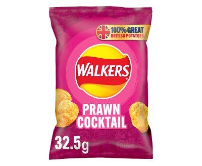 Walkers Prawn Cocktail Crisps made from 100% great British potatoes. 32×32.5g pack.